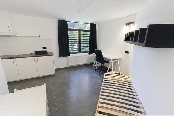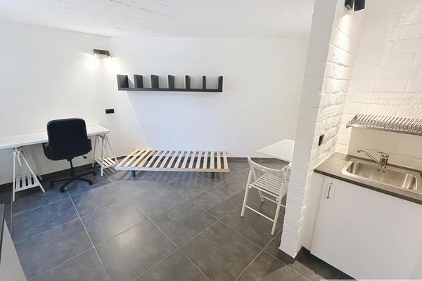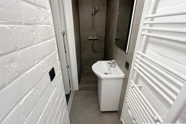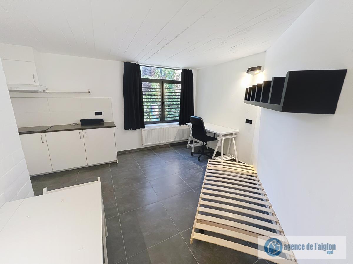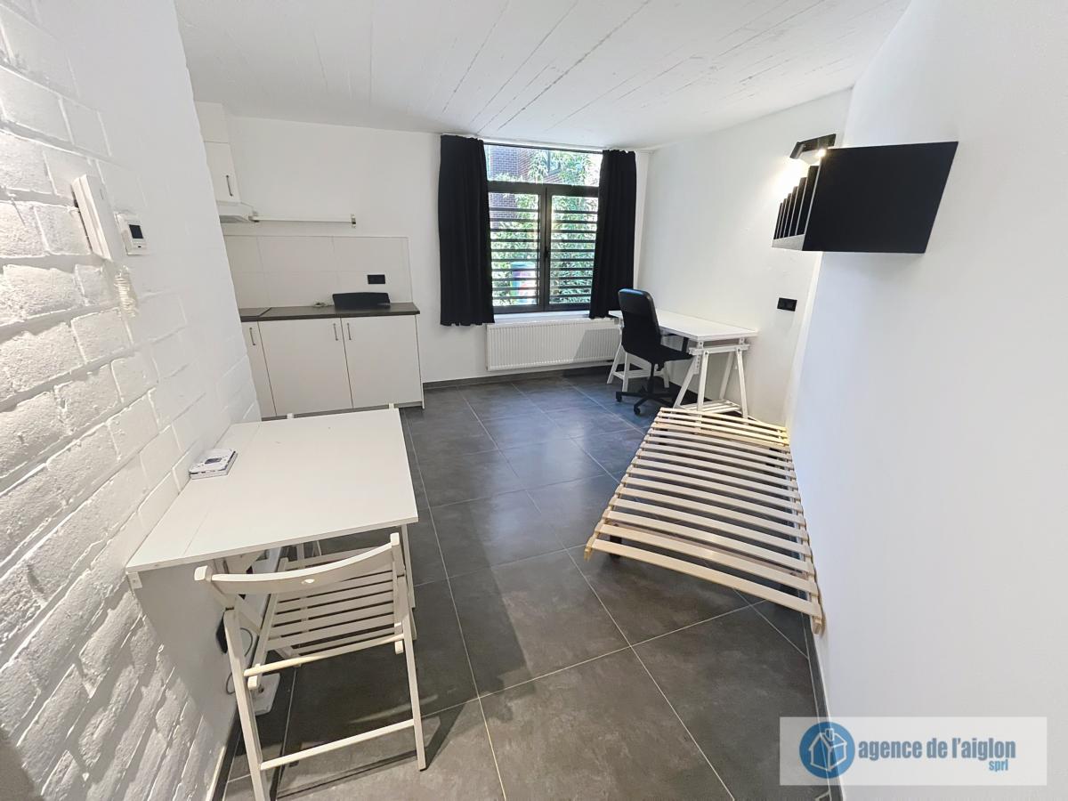 Studio entièrement remis à neuf et meublé (sauf matelas) comprenant une pièce principale, un coin cuisine (plaques vitro, hotte et frigo). Salle de douche avec lavabo et WC.