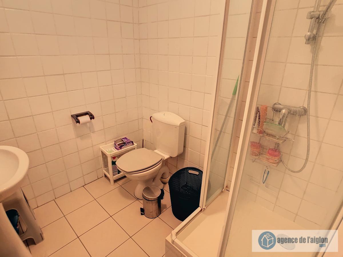 Grand Cortil 12B : Pièce principale avec coin cuisine équipée + salle de douche avec wc.