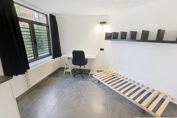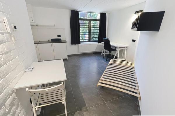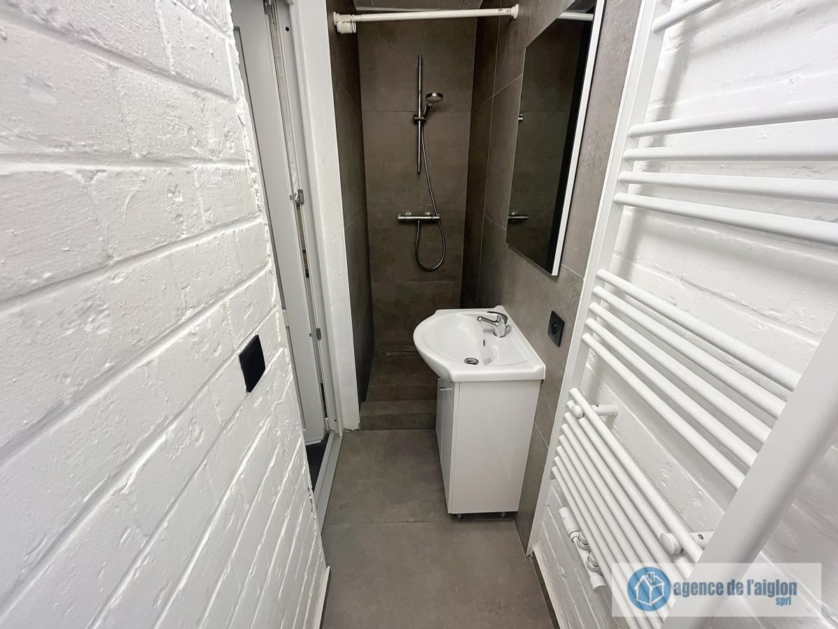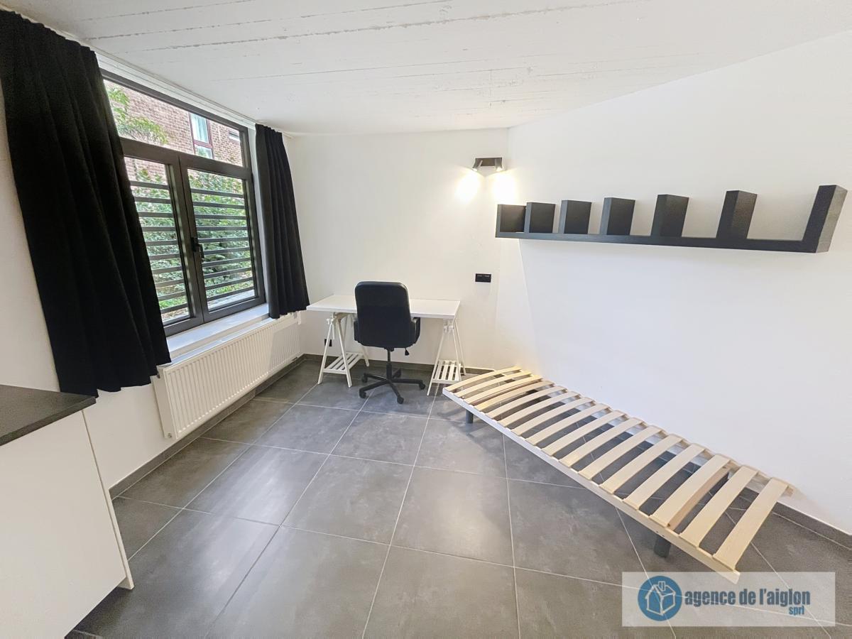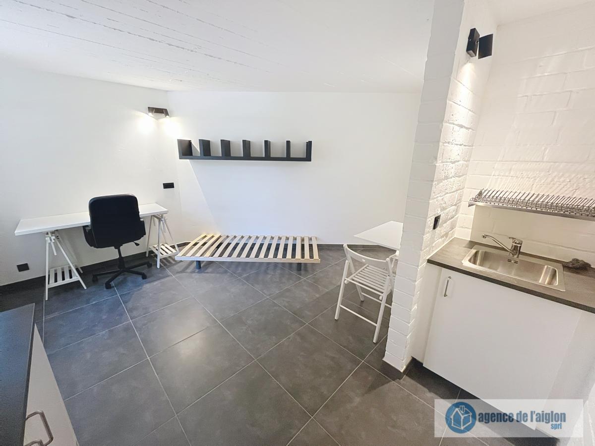 Studio entièrement remis à neuf et meublé (sauf matelas) comprenant une pièce principale, un coin cuisine (plaques vitro, hotte et frigo). Salle de douche avec lavabo et WC.